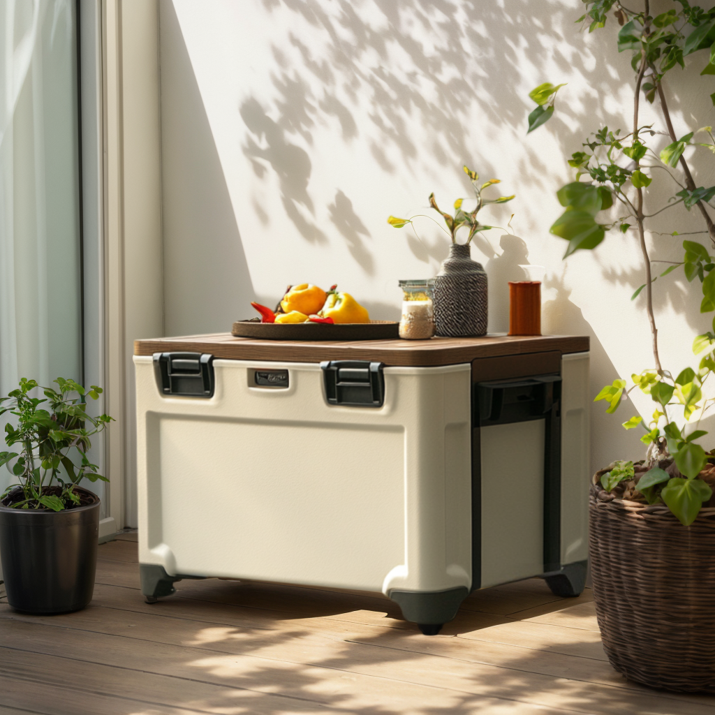 This Outdoor Multi-Functional Storage Box is designed to combine elegance with practicality, making it the perfect companion for your next outdoor adventure or home use. Its modern, minimalist design with a beige plastic body and a rich woodgrain-textured lid blends seamlessly with any outdoor or patio setting.